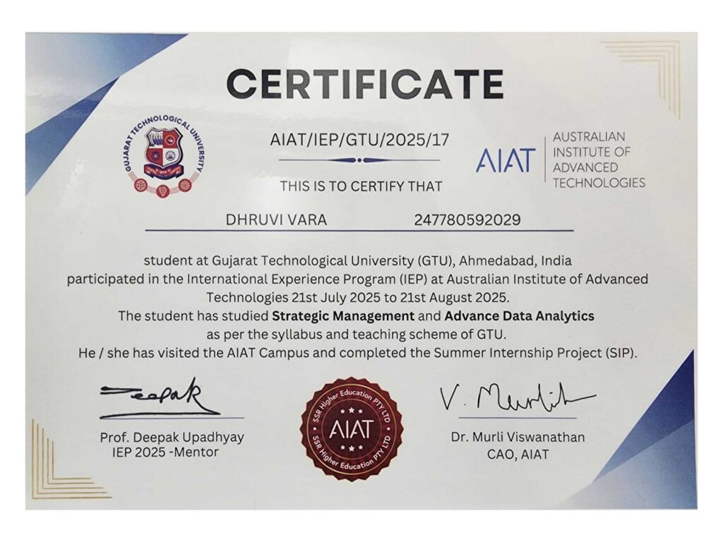 Ms. Dhruvi Vara and Ms. Sanjana Gareja, MBA students specializing in Marketing (Batch 2024–2026), successfully attended the International Exchange Program (IEP) in Australia arranged by GTU for its students. During the program, they completed two academic courses along with a Summer Internship Project (SIP), gaining valuable global exposure and practical learning experience.