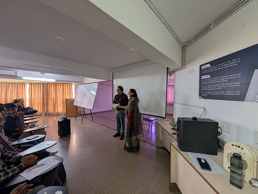 The day began with an academic orientation on the GTU syllabus, followed by an innovative hands-on activity – Make and Sell Cards. Students worked in teams to design and craft creative cards, interpreting management values through art.