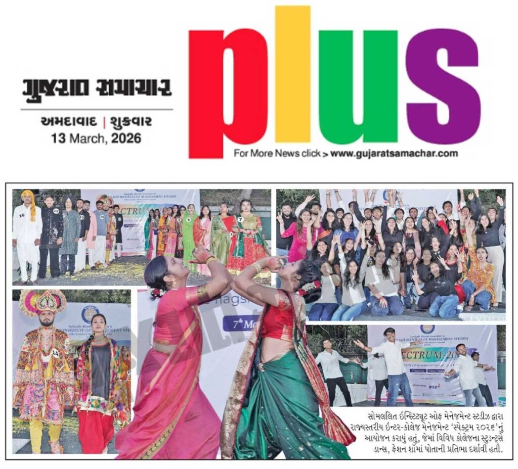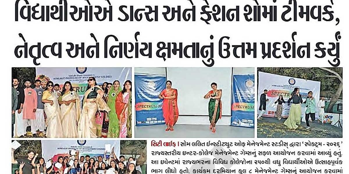 We are delighted to share that Spectrum 2026 – the Inter-College Management Event, organized by SomLalit Institute of Management Studies (SLIMS), received media coverage in Gujarat Samachar on 13/3/2026 and Sandesh on 14/3/2026.